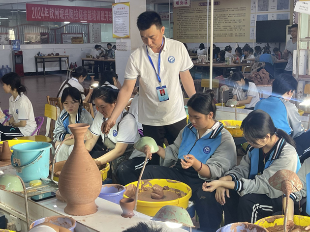 在广西钦州商贸学校,张海担任民族工艺品制作(坭兴陶方向)专业教师。为帮助学生学好专业课程,他采用“教室+工作室+生产基地”教学模式——用理论讲解夯实基础,借实操示范传授技艺,让学生高效掌握坭兴陶技艺,将专业所学转化为就业创业的“金钥匙”。